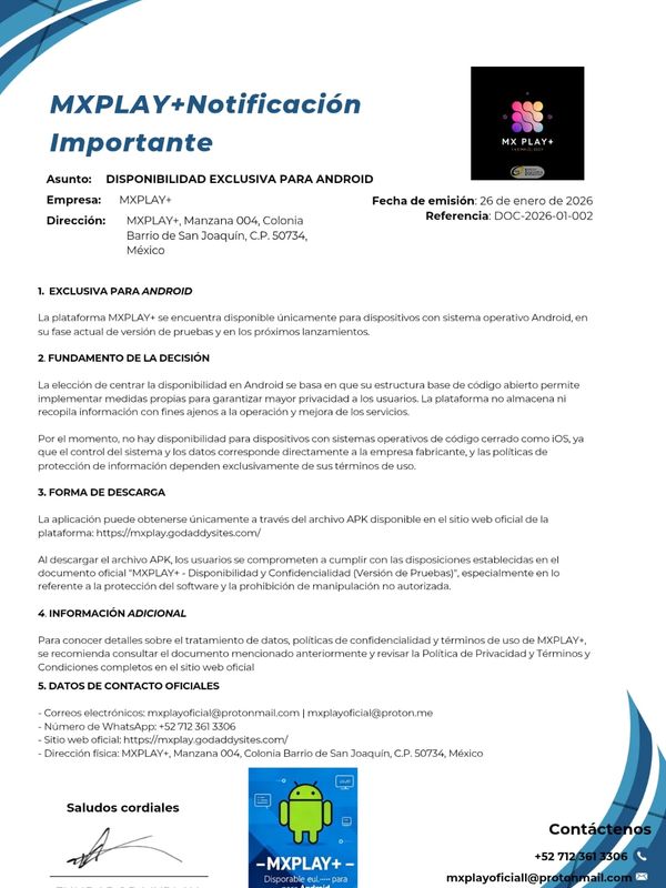 Si necesitas asistencia técnica o tienes alguna consulta sobre Mxplay+, no dudes en contactarnos. Nuestro equipo de soporte está disponible para ayudarte con cualquier problema que puedas enfrentar. Valoramos tu experiencia y queremos asegurarnos de que obtengas el máximo provecho de nuestra aplicación.